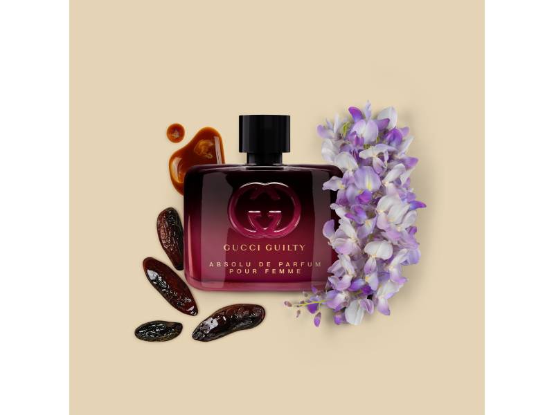 Plăcerea vinovată de Sărbători, Guilty Absolu are în inimă un acord de cafea amaretto, cu o aromă catifelată și profundă, îmbinată cu absolut de boabe tonka, opulente și învăluitoare, contrastată de dulceața delicată a acordului de glicină.