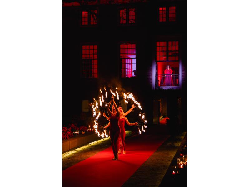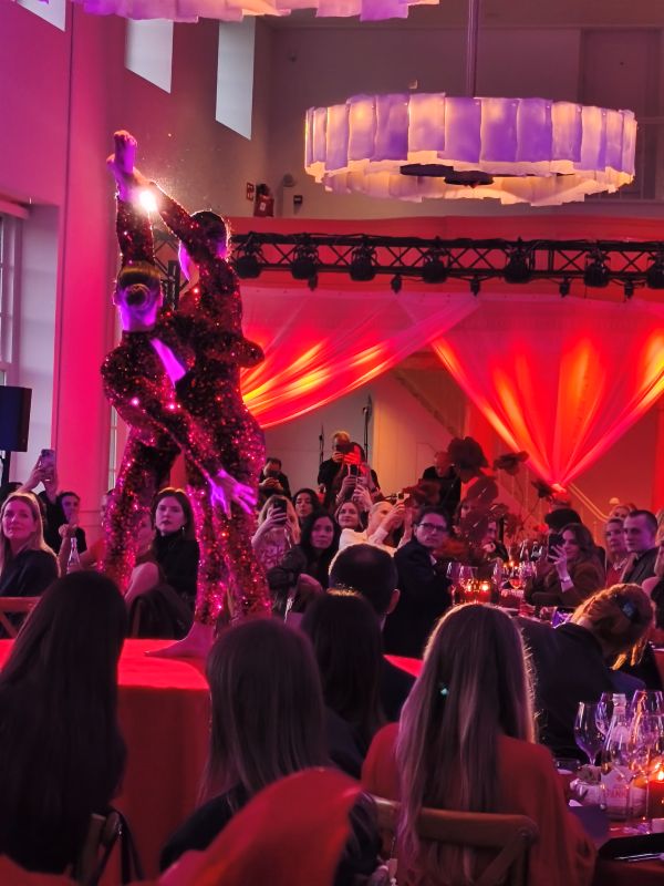 A urmat o cină cu preparate fine, într-un decor din care nu au lipsit muzica, socializarea și florile roșii, dar și un spectacol emoționant. Și, când credeam că am epuizat toate surprizele, a mai urmat una: spectacolul de lumini și acrobatele ce păreau că plutesc în aer, în echilibru.