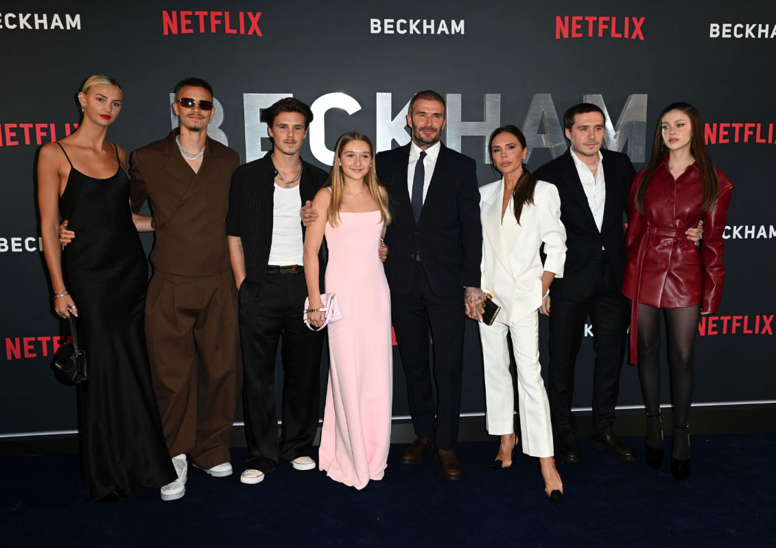 Mia Regan, Romeo Beckham, Cruz Beckham, Harper Beckham, David Beckham, Victoria Beckham, Brooklyn Beckham și Nicola Peltz Beckham, Londra, 2023