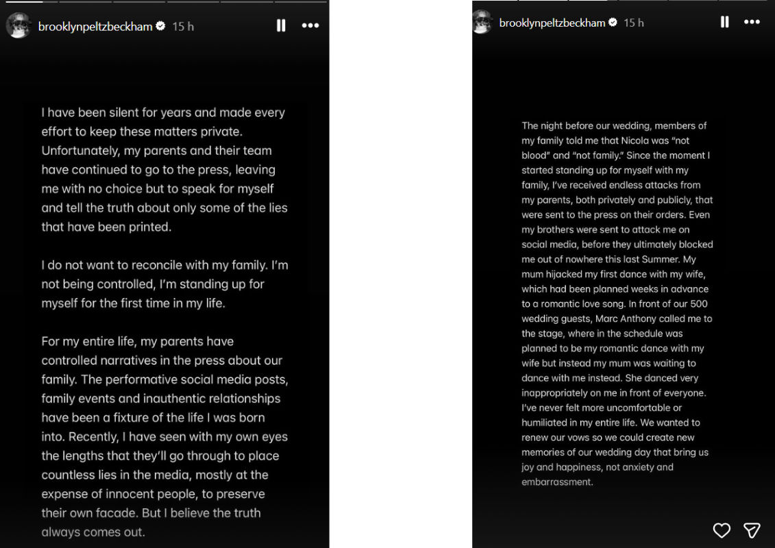 Într-o postare extrem de dură pe Instagram, Brooklyn Beckham își acuză părinții că au încercat constant să-i saboteze relația și că au vorbit-o de rău pe Nicola Peltz în repetate rânduri. Tânărul afirmă că mama sa, Victoria Beckham, creatoare de modă, ar fi refuzat în ultimul moment să mai realizeze rochia de mireasă a Nicolei, forțând-o pe aceasta să își găsească rapid o ținută alternativă pentru nunta care a avut loc în aprilie 2022, în Palm Beach, Florida, la reședința părinților miresei.