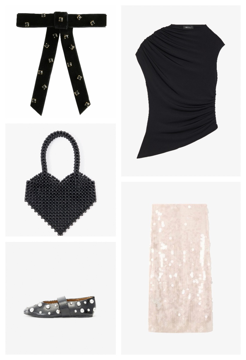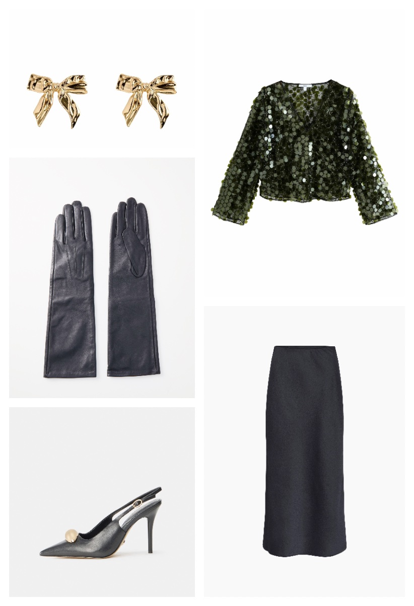Bluză paiete Next, zalando.ro, 334 lei; Mănuși Anna Field, zalando.ro, 134 lei; Cercei Next, zalando.ro, 87 lei; Fustă Kaffe, zalando.ro, 215,40 lei; Pantofi Aldo, zalando.ro, 390 lei