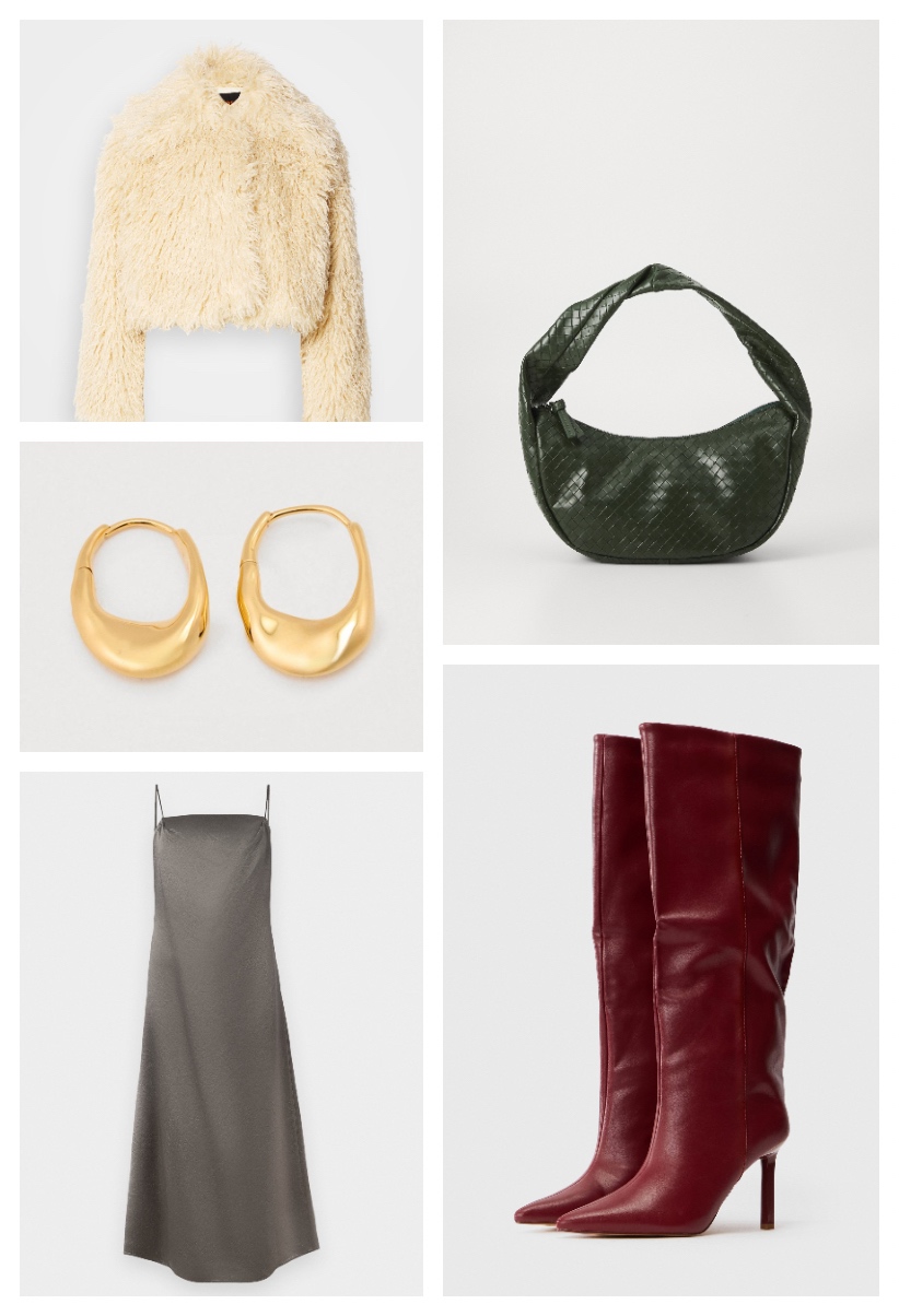 Geantă Becksöndergaard, zalando.ro, 180 lei; Rochie MM, zalando.ro, 500 lei; Jachetă Boss, zalando.ro, 1423 lei; Cercei Monica Vinader, zalando.ro, 919 lei; Cizme Simmi London, zalando.ro, 386 lei