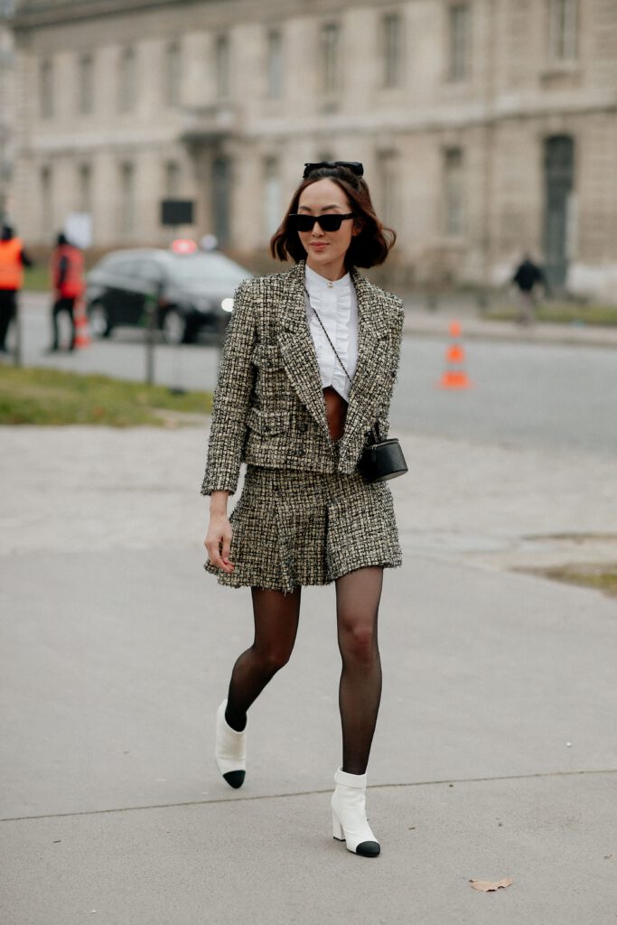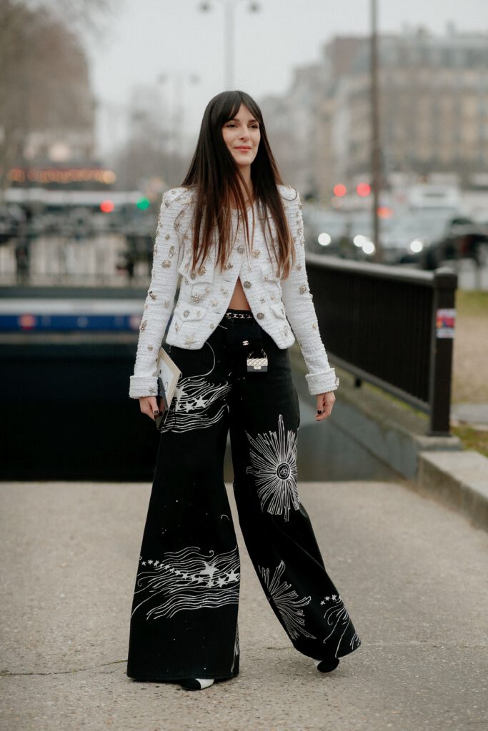 Începem direct cu lookul nostru favorit, purtat de Leia Sfez, care a mizat pe o imagine 70s pentru prezentarea Chanel. Sacoul alb cambrat, din tweed, a fost acompaniat de o pereche de pantaloni palazzo, compunând un outfit lejer, dar sofisticat. Caroline de Maigret poartă o piesă-hibrid care ne place la fel de mult. Dacă te încâtă ideea, poți include pe sub sacoul tău clasic scurt, o jachetă lungă dintr-un material care se potrivește perfect cu pantalonii și cu sacoul. Efectul e foarte rafinat.