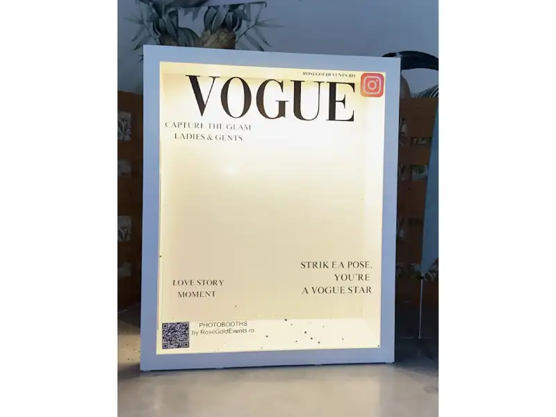 Invitații intră literalmente într-un decor care arată ca o copertă de revistă. Cu lumină perfectă, un design elegant și text personalizat pentru evenimentul tău, această cabină e mai mult decât un decor – e o experiență.