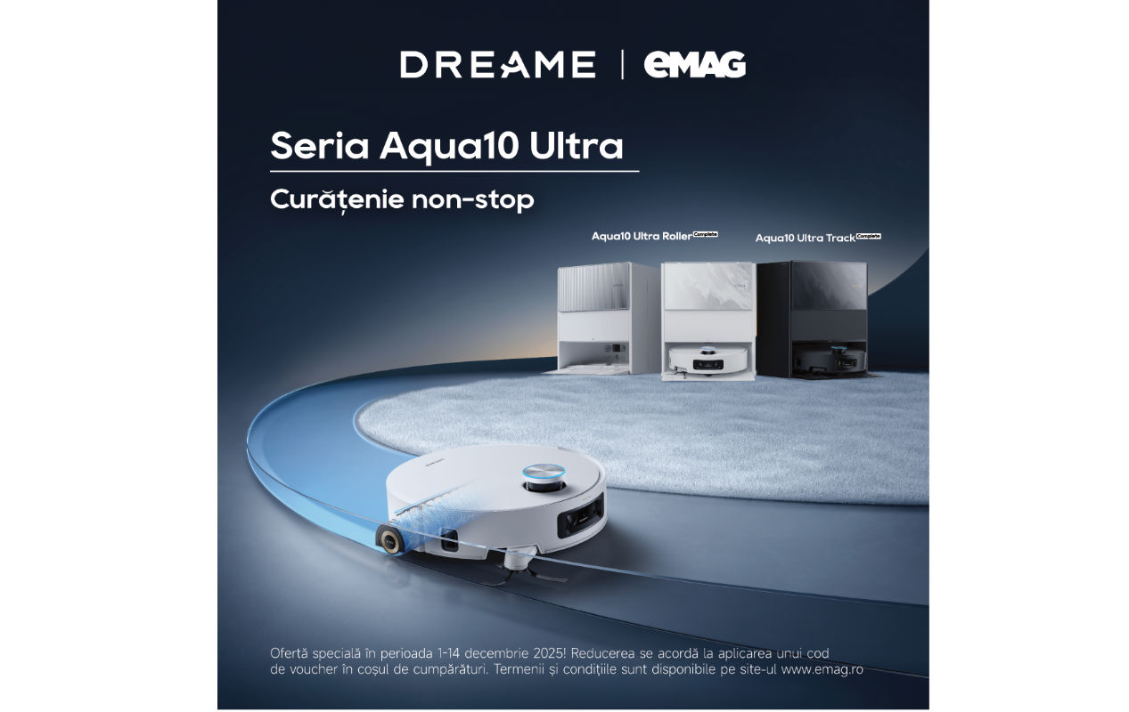 Seria Aqua10 Ultra, cu noua generație de roboți de curățare a podelelor Dreame, va fi disponibilă la ofertă specială în perioada 1-14 decembrie 2025. Reducerea se acordă la aplicarea unui cod de voucher în coșul de cumpărături. Termenii și condițiile sunt disponibile pe site-ul http://emag.ro/.