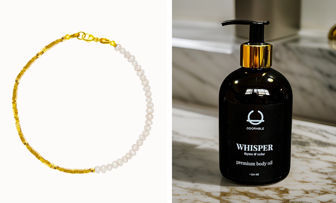 Brățară de picior Empe Jewelry, empejewelry.com, 230 lei ; Ulei de corp Odorable, sana-candles.ro, 110 lei