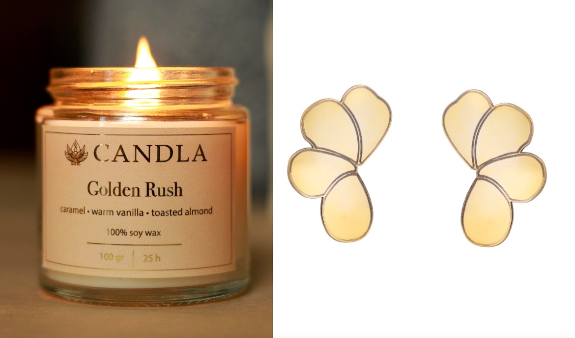 Lumânare Candla, Alist Designers boutique, 80 lei ; Cercei Silver Moon, 620 lei