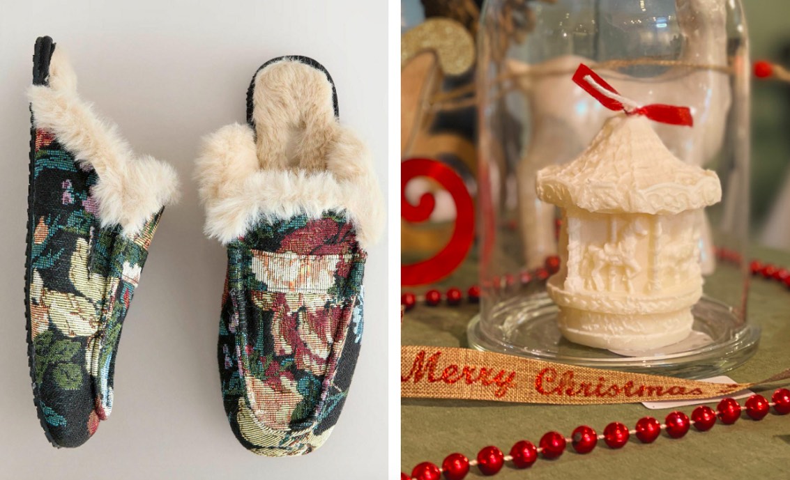 Papuci de casă Next, zalando.ro, 195 lei ; Lumânare Wax’n Magic, 55 lei