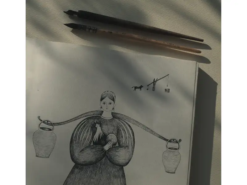 Ilustrațiile mele, desenate în tuș negru, poartă inserții de tradiție și contemporan. Sunt o punte între două lumi – între trecut și prezent, între ceea ce s-a spus și ceea ce se mai poate spune.