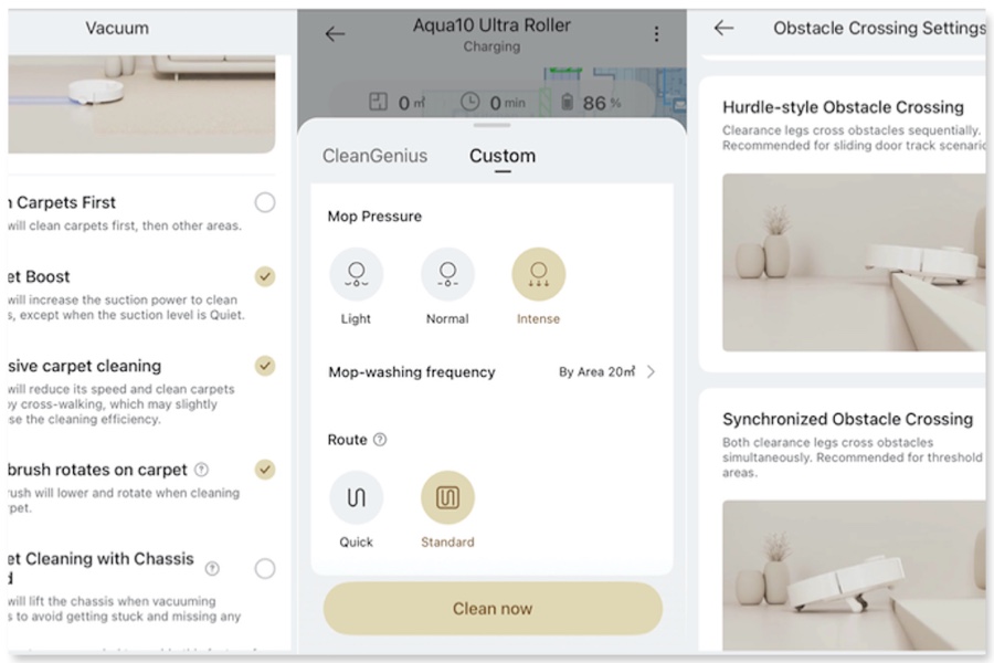 În plus, unul dintre lucrurile care diferențiază imediat Aqua10 de generațiile anterioare este felul în care se mișcă prin casă. Dacă X50 Ultra se descurca foarte bine pe praguri și denivelări mici, Aqua10 merge mai departe cu sistemul ProLeap™, capabil să depășească obstacole de până la 8 cm. În practică, asta înseamnă că trece fără ezitare peste covoare groase, baze de mobilă ceva mai ridicate sau praguri pe care alte modele le evită. Robotul se adaptează inteligent la înălțimi diferite și decide rapid dacă poate avansa sau dacă trebuie să ocolească.