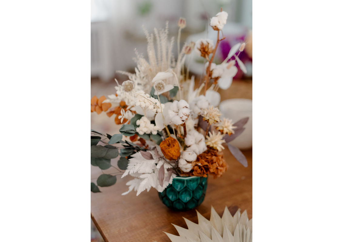 Atmosfera este caldă, relaxată. Muzica este discretă. Masa este pregătită cu flori stabilizate, flori criogenate, materiale naturale, suporturi și accesorii atent alese.