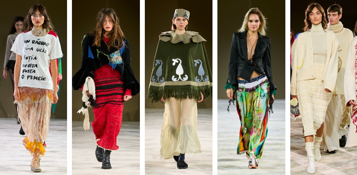 Una dintre cele mai plăcute surprize a venit sub forma reprezentării curajului de a ieși din tipare, prin lookuri complexe, în care jocurile de formă și culoare au generat o atmosferă ce părea desprinsă din filmele rebelilor de altădată. Influențe punk în acord cu delicatețea texturilor translucide, piese croșetate versus catifea, pictură și denim, messy hair și smokey eye – hainele spun mai mult decât povestea unei transformari materiale. Alexandra Șipa a creat din momentul său un adevărat manifest feminist prin tricourile cu mesaje puternice, preluate din titlurile știrilor legate de cazurile de femicid din România, în încercarea de a-și mobiliza comunitatea.