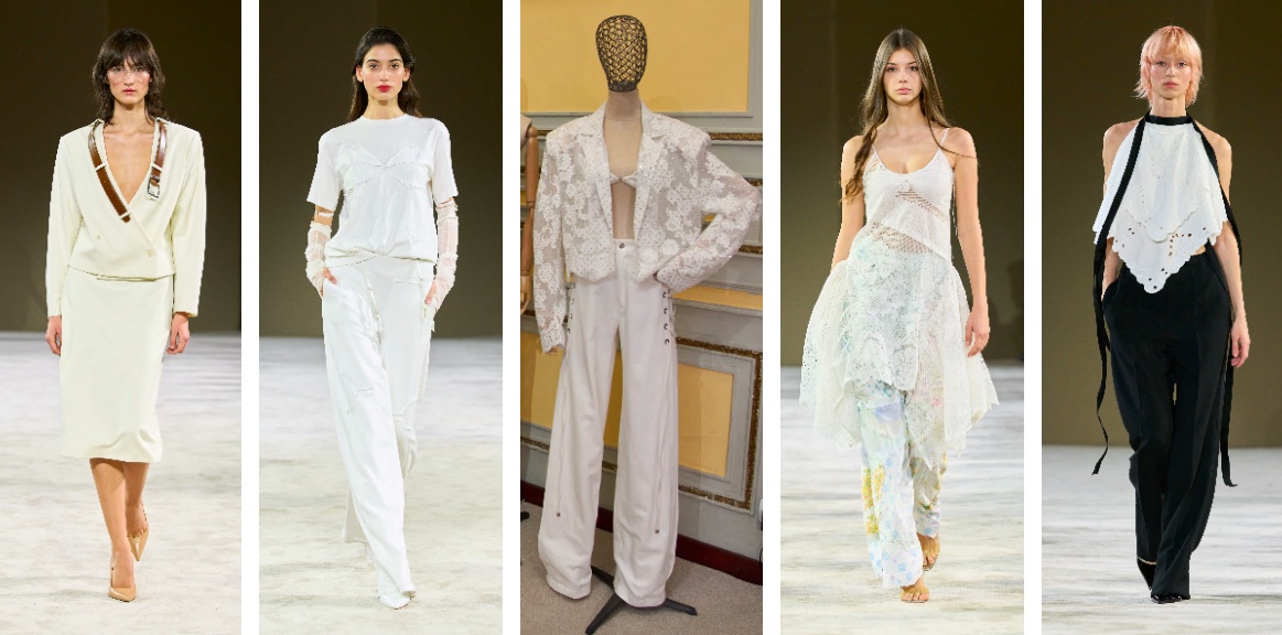 Cum era minimalismului se apropie de final, avem în față o pânză albă pe care putem așterne tot ce visăm. La propriu! Ținutele albe au dominat podiumul de la MBBFW, atât prin structuri tailored, riguroase, cât și prin ținute compuse din piese fluide. Nu au lipsit broderiile prețioase, inserțiile din dantelă sau detaliile boudoir. Completate de beauty looks naturale, cu accent pe linia pomeților, outfiturile all white sau contrastele cu negru inspiră la redefinirea outfiturilor day-to-day.